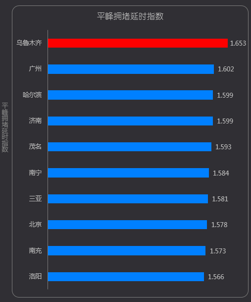 尽管西北地区总是给大家地广人稀的印象,但乌鲁木齐却是一个隐形拥堵TOP10城市,本年度以1.653的平峰拥堵延时指数力压2015年的杭州和2016年的兰州成最堵平峰城市,广州、哈尔滨、济南、茂名均跻身前五。