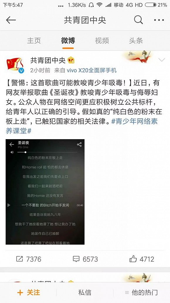 此前嘻哈歌手PG One 不仅因为过夜门遭到舆论指责,而是其歌词中含有侮辱女性、教唆青少年吸毒倾向等各种问题被共青团官方媒体点名批评,最终酝酿成一场风风火火的社会事件。