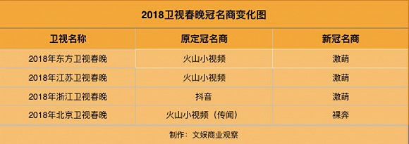 这意味着卫视春晚临时换冠名商了,此前备受关注的火山小视频、抖音等短视频金主爸爸们在毫无准备的情况下就被封杀了。
