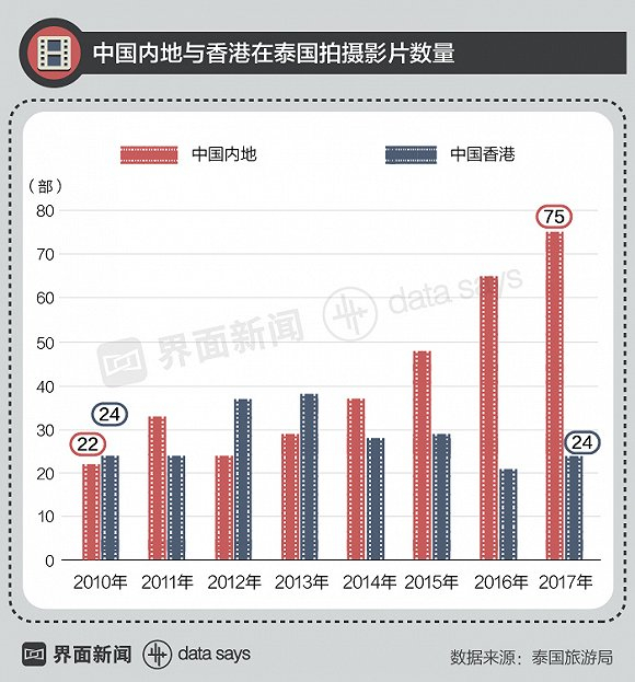 2017年中国内地共有75部影片在泰国取景拍摄,是2010年的3倍多,增长极快。