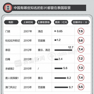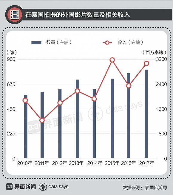其实,泰国一直是国际影视公司们最青睐的外景拍摄地之一。泰国旅游局数据显示,近8年来,到泰国取景的外国影片数量从578部增至810部,产生的相关收入也从18.7亿泰铢(约合3.7亿人民币)增至30.7亿泰铢(约合6.1亿人民币)。