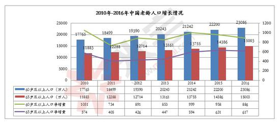 (2)从增加数量来看,截止2016年底,60岁以上老人每年增加900万,接近1个天津市,65岁以上老人每年增加600万,相当于1个澳门。