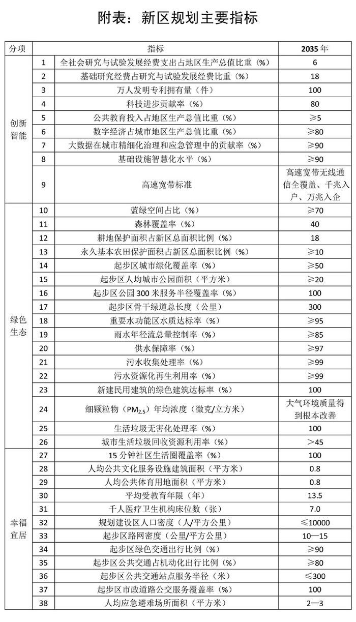 严控城镇开发边界和人口规模。划定起步区、外围组团、特色小城镇开发边界,实行战略留白,为国家重大发展战略和城市可持续发展预留空间。合理控制人口密度,新区规划建设区按1万人/平方公里控制。