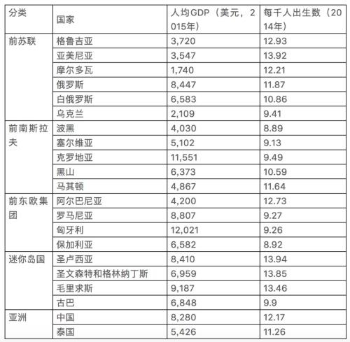 前苏联东欧集团、前南斯拉夫:这些前社会主义国家在苏东剧变之前已经达到了较高的社会发展水准,妇女地位较高,生育率也下降到和西欧类似的低水平迷你岛国:迷你国家,产业单一,年轻人流失东欧以外的非小岛国家,只有两个:中国、泰国