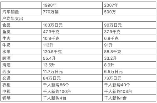 日本1990年到2007年各类消费变化情况: