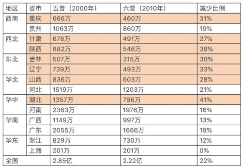 由上表可以看出,较发达的地区,由于有大量年轻人涌入并定居生子,0-14岁人口减少的比例相对较少。而不发达地区,由于大量年轻人流失到沿海发达地区,0-14岁人口减少比例相对较大。特别是对于那些人口流失多、且生育率较低的省市而言,则更加严重。