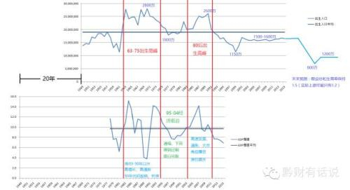 下图是1949年以来的中国人口出生数量和1978年以来的中国GDP增速对比图。其中,人口出生图向右平移了20年,代表出生人口平均在约20年后进入劳动力市场,并逐步开始准备结婚、买房、买车、添置家电等大宗消费。