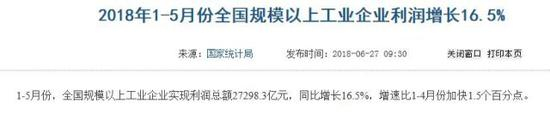 6月27日,国家统计局发布数据显示,1-5月份,全国规模以上工业企业实现利润总额27298.3亿元,同比增长16.5%。