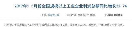 而去年此时,即2017年6月27日,国家统计局发布的数据显示,2017年1-5月份,全国规模以上工业企业实现利润总额为29047.6亿元。
