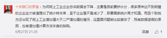 对此,网友十字路口的罗盘留言认为:规模以上工业企业总体数据会下降,主要是要挤水分,很多原来达不到规模的企业这次被清理出了统计样本库。他认为,这里面问题就比较复杂,既有数据造假的原因,也有增加值计算方法本身的缺陷。