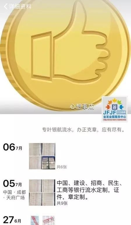 通过一个购买链接,记者添加了名为“心想事成”、号称提供银行流水代办服务的微信号。在这个微信号的朋友圈介绍里,赫然写着,“专叶银航流水,办正克章,应有尽有”。尽管错字连篇,但还是能看出他真正从事的业务。