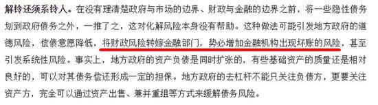 解铃还须系铃人。在没有理清楚政府与市场的边界、财政与金融的边界之前,将一些隐性债务划到政府债务之外,一推了之,这对化解风险本身没有帮助。这种做法可能引发地方政府的道德风险,偿债意愿降低,将财政风险转嫁金融部门,势必增加金融机构出现坏账的风险,甚至引发系统性风险。事实上,地方政府的资产负债是同时扩张的,有些基础资产的质量还是相对良好的,可以对其债务偿还形成一定的担保。地方政府的去杠杆不能只关注负债方,更要关注资产方,完全可以通过资产出售、兼并重组等方式来缓解债务风险。