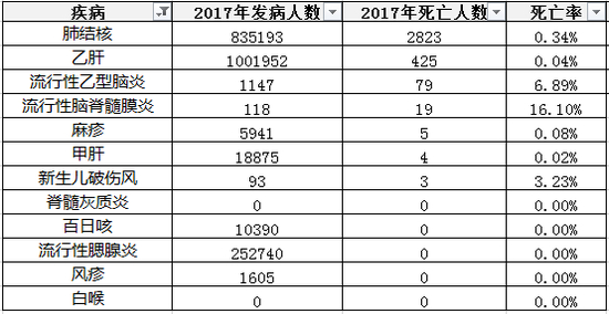 下图是我根据2017年中国疾病预防控制局数据制作的2017年中国传染病死亡率表格: