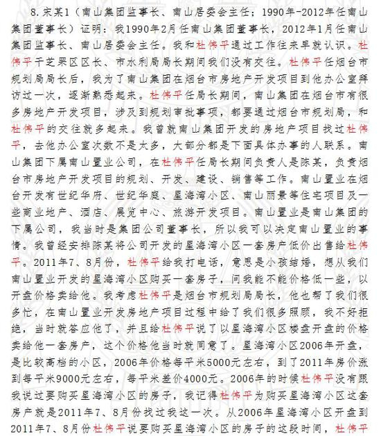 宋作文证言中称,他考虑杜伟平是烟台市规划局局长,也帮了他们很多忙,在南山置业开发房地产项目过程中给了他们很多照顾,他不好拒绝,当时就答应杜伟平了。“我这样低价卖给杜伟平一套房子,也是为了和他处理好关系,好在我们开发项目时得到他的关照。”