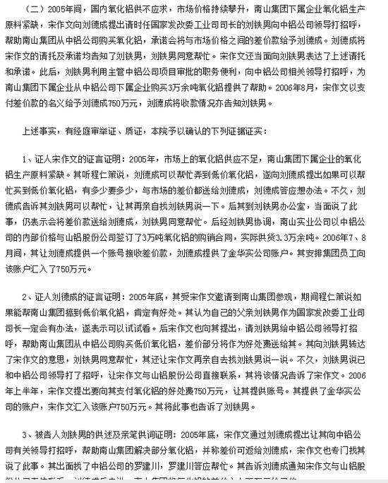 其二,2005年,刘铁男再次接受宋作文请托,以向中国铝业时任副总裁罗建川打招呼的方式,为南山方面与中铝下属的山东铝业签订3万吨氧化铝供销合同提供帮助。2006年8月,宋作文将上述氧化铝购销差价中的750万元汇入刘铁男之子刘德成控制的账户。