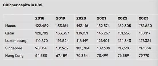 澳门以博彩闻名,被誉为“中国的拉斯维加斯”。IMF公布的2018年经济数据中,澳门人均GDP为122489美元(约合837138元),已经位居第二,仅次于盛产石油的卡塔尔(128702美元,约合879600元)。此外,卢森堡排名第三(110870美元,约合757729元),新加坡以98014美元(约合669866元)排名第四,而香港以64533美元(约合441044元)排名第十。