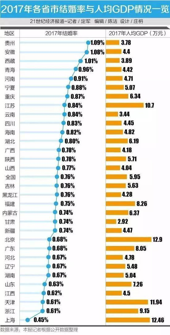 比如结婚率排在前三的贵州、安徽和西藏,都属于相对落后的地区,人均GDP低于全国平均水准。而那些经济发达的东南沿海省份,像两大直辖市天津、上海以及浙江,结婚率远低于贵州等地,上海甚至只有4.5‰,不到贵州的一半。