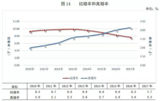 不同的是,离婚率没有像结婚率那样,有一个先升再降的过程,而是一路走高,从2010年的2‰,提升到2017年的3.2‰。