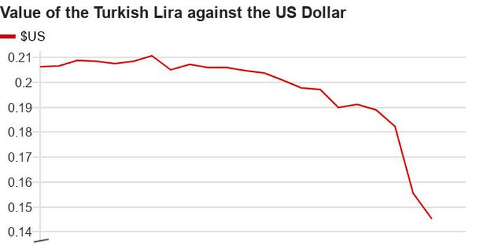 8月1日,美国宣布因布伦森至今仍被土耳其监禁,美方决定制裁土耳其司法部长和内政部长。10日,美国宣布将土耳其钢铁和铝产品进口关税提高一倍,加剧了土耳其里拉对美元汇率下跌。