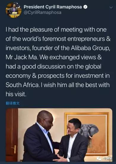 在约翰内斯堡,在与马云对谈90分钟后,南非总统拉马福萨发推特感慨说:“我很荣幸跟全球最重要的创业者之一、阿里巴巴的创始人马云进行了会面,我们就全球经济和南非发展前景交流了看法,聊得非常愉快。”