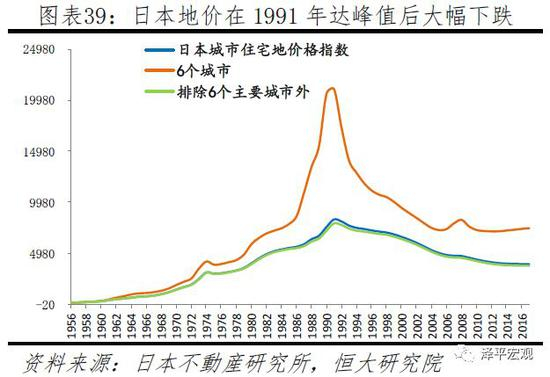 1975年日本房价调整后还能继续上涨,主要在于经济增长和主力购房人群支撑,但因后期上涨过快、出生人口大幅下滑、1990年代主力置业人群见顶以及日本政府错误应对等,导致1990年代初房地产泡沫破灭。之后日本地价持续调整至2005年,2017年日本地价仅是峰值的47.1%。六个核心城市地价从1992年一直下跌到2005年,在经历了2006-2008年的短期上涨之后,因全球金融危机于2009-2012年再次下跌,2013年开始回升至今,2017年地价仅相当于1991年峰值的35.3%;因人口流出,日本非核心城市地价从1992年一直下跌至今,2017年地价相当于1991年峰值的47.5%。