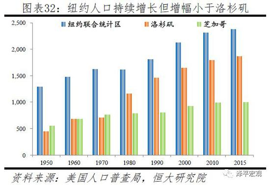 纽约有多重涵义:纽约市、纽约都会区、纽约联合统计区等。其中,纽约市土地面积为789平方公里,2015年人口855万;纽约都会区(New York-Newark-Jersey City Metropolitan Statistical Area,NY-NJ-PA MSA)面积约1.7万平方公里,2015年人口2018万;纽约联合统计区(New York-Newark Combined Statistical Area)由纽约都会区及毗邻都会区组成,2015年人口2372万。从人口看,由于美国经济重心向西海岸、南海岸偏移,1950-2015年纽约地区人口虽基本持续增长,但增幅84%远小于洛杉矶地区的328%,这使得纽约地区的人口占比明显下滑。期间,因人口郊区化及制造业衰退,纽约市人口在1950-1980年从789万减至702万;后因城市更新及产业转型升级等,回升至2015年的855万。