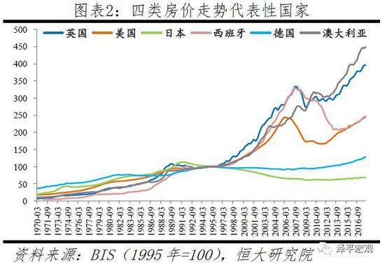随着经济金融全球化深入推进,全球房价走势联动性逐渐增强。比如,1980年代中后期北欧四国房价下跌,1990年代初日韩房价下跌,1997年东南亚房价下跌,2007年全球房地产下跌。从房价走势看,近50年23个经济体可大致分为四类: