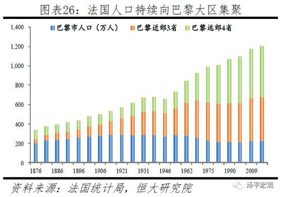 巴黎有三个范围:巴黎市(或称小巴黎)、大巴黎(包括近郊3省)、巴黎大区(包括远郊4省,又称“法兰西岛”),土地面积分别为105、761、12001平方公里,其中巴黎大区土地面积占法国的1.8%。随着产业集聚,法国人口长期持续向巴黎及周边地区集聚,1876-2014年巴黎大区人口从332万人基本持续增至1203万人,人口占比从8.6%提升至18.8%,经济份额从1990年的28.4%提升至2014年的30.4%。期间,出于控制人口以治理大城市病的目的,巴黎市有过较长时间减少,1931-1999年从289万持续降至213万,之后回升至2014年的222万。