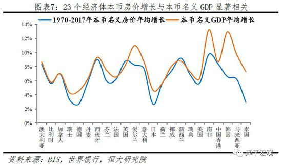 从近期看,2010-2017年全球48个经济体美元房价涨幅与美元名义GDP涨幅高度相关,两组数据相关系数达0.80。2010-2017年,48个经济体美元房价累计涨幅的平均数为10.4%、中位数为1.2%,美元名义GDP涨幅的平均数为15.7%、中位数为9.1%。其中,美元房价涨幅超过70%有冰岛、中国香港、印度、菲律宾、新西兰,与之对应的美元GDP涨幅分别为79.6%、49.3%、56.8%、57.1%、40.4%;而涨幅为负且居前的有俄罗斯、希腊、西班牙、意大利、巴西、南非等,与之对应的美元GDP涨幅为3.4%、-33.1%、-8.4%、-9%、-6.9%、-6.9%。