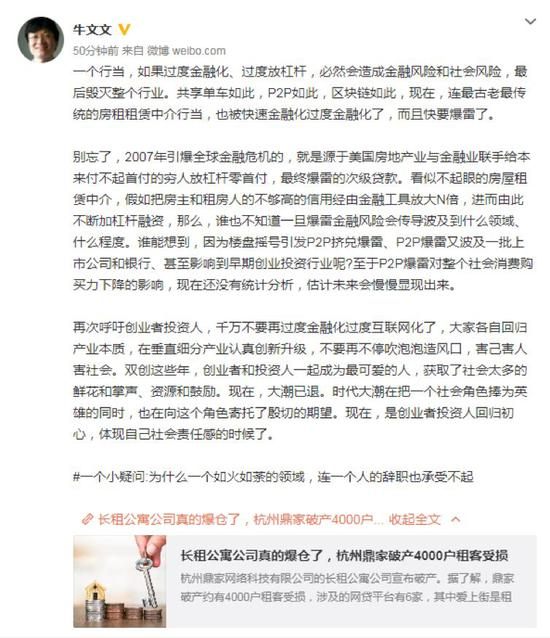 创业黑马董事长牛文文针对此事于8月23日在微博转发文章并发声评论称,“一个行当,如果过度金融化、过度放杠杆,必然会造成金融风险和社会风险,最后毁灭整个行业。共享单车如此,P2P如此,区块链如此,现在,连最古老最传统的房租租赁中介行当,也被快速金融化过度金融化了,而且快要爆雷了。”牛文文以2007年全球金融危机举例,他表示,当时的危机就是源于美国房地产业与金融业联手给本来付不起首付的穷人放杠杆零首付,最终爆雷的次级贷款。“看似不起眼的房屋租赁中介,假如把房主和租房人的不够高的信用经由金融工具放大N倍,进而由此不断加杠杆融资,那么,谁也不知道一旦爆雷金融风险会传导波及到什么领域、什么程度。”