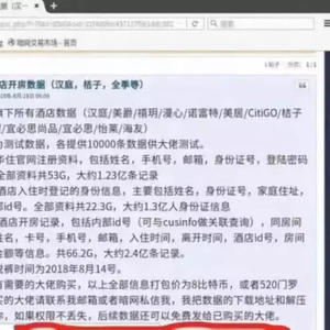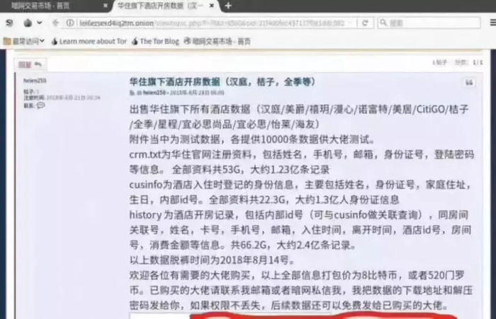 8月28日,一张“黑客出售华住酒店集团客户数据”的截图在社交网络中流传。截图显示,一名黑客在“暗网”(网络黑市)发帖叫卖华住集团开房数据。贴文称,数据涉及华住旗下汉庭、美爵、禧玥、诺富特、美居、CitiGO、桔子、全季、星程、宜必思尚品、宜必思、怡莱、海友等所有酒店截至8月14日的数据。全部信息打包售价为8个比特币(约38.3万元人民币)或520门罗币(约36.5万元人民币)。