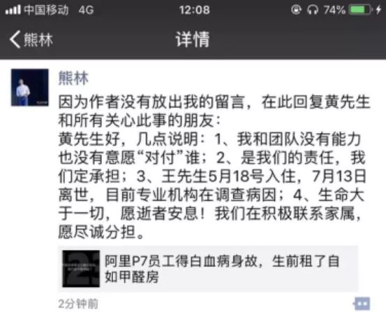 8月31日,一篇《阿里P7员工得白血病身故 生前租了自如甲醛房》的文章在朋友圈刷屏,称阿里员工王先生因病去世,家属检测其生前租住的自如房间甲醛严重超标。