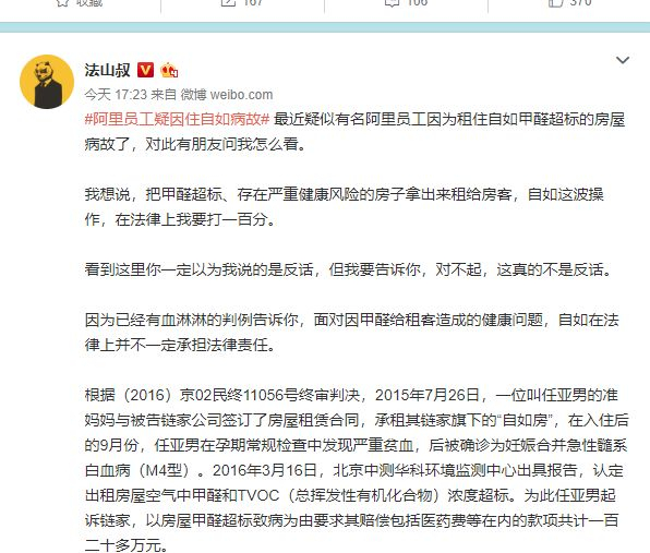 #阿里员工疑因住自如病故# 最近疑似有名阿里员工因为租住自如甲醛超标的房屋病故了,对此有朋友问我怎么看。