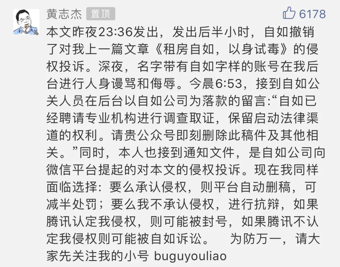 基金君发现,在原作者“呦呦鹿鸣”文章下的评论区,作者设置了一条置顶留言,称收到自如公关人员的留言,要求他删除即刻删除稿件,否则将启动法律程序提起诉讼;同时,作者的公众号后台收到了自如公司对文章的侵权投诉。