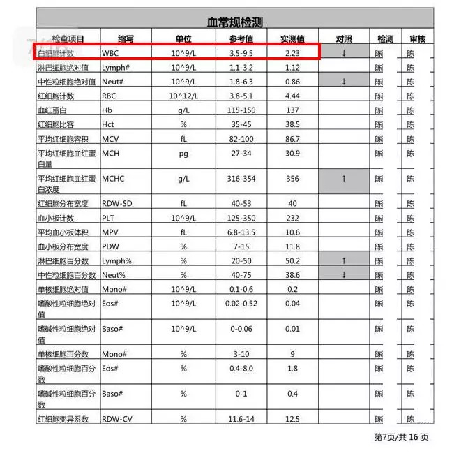 7月6日的体检报告显示,刘雅体内白细胞的检测值仅为2.23。