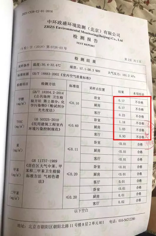 机构的检测结果显示,刘雅卧室、厨房、客厅的甲醛、TVOC均超标。