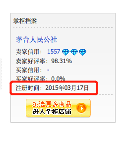 淘宝网资料显示,向阳曙文出售6瓶“茅台酒”的卖家“茅台人民公社”,在淘宝平台注册入驻的时间为2015年3月17日。可是,淘宝公司的入驻审核资料显示,该卖家提供的营业执照登记时间为2015年5月6日,食品流通许可证的有效期始于2015年4月23日。