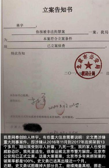 期间,林勇表示遭受非人折磨,九死一生,度日如年,生不如死……直到2017年底被北京警方解救,体重一度减少三分之一。最后,他于2018年8月3日报案。