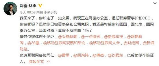 他表示,那时候史文勇找了他的亲属代替林宇在辞职声明上签字,但是林宇其实一直没有辞职,只是史代替林辞职。帮他伪造签字的亲属是网秦的董秘,是史文勇太太的姐姐。