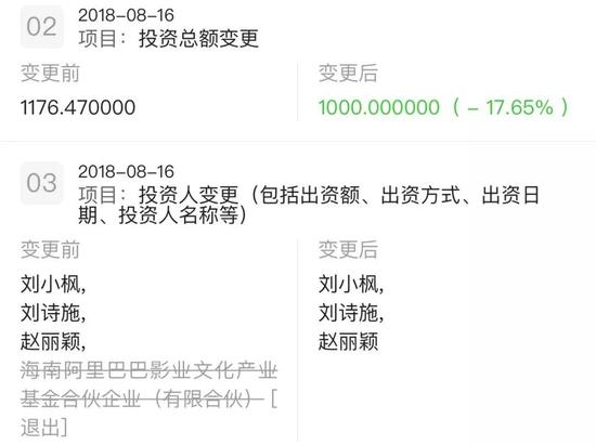 近日,阿里影业全数退出了江苏稻草熊影业。8月16日,江苏稻草熊影业投资人信息变更,海南阿里巴巴影业文化产业基金合伙企业退出,稻草熊影业投资总额从此前的1176.47万变更为了1000万。