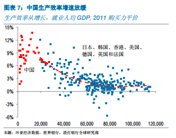 5. 进一步放开当前二孩政策的迫切性还体现在中国生产率正在放缓。劳动生产率增幅从 2010 年的 10.2%放缓到 2017 年的 6.8%(图表 7)。从日本、韩国、香港、美国、英国、德国和法国等地的经验看,随着中国就业人均 GDP 增长,生产率增幅还会进一步放缓。这使得放开生育限制的必要性更为紧迫,因为放开生育限制可以纾缓被生产率增速和劳动力数量减少同时双重打击所带来的影响。