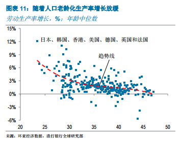 第二,根据联合国的数据,2017年中国总人口的年龄中位数从 1970 年的 19.3 低点提高至 37.6,高于世界平均水平 30.1 和亚洲平均水平 31,也高于非洲平均水平 19.5 和 拉美平均水平 29.9。联合国预计到 2040 年,中国总人口年龄中位数将超过欧洲平均水平 46.9。根据世界经验,人口老龄化将通过拉低生产效率增速从而影响中国经济增长前景(图表 11)。