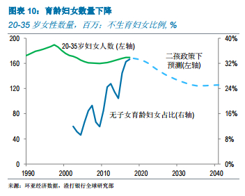 1970年代末中国开始实施计划生育政策(独身子女)。在此之前鼓励多生育,因为当时的领导人认为人口多能带来更多经济增长,1940 年代和 1960 年代两次大的婴儿潮,为中国 1980 年以来快速工业化进程创造了巨大的人口红利(图表 8)。 计划生育政策的实施力度在不同时点和地区有所不同。例如,1980 年代和 1990 年代政策实施较为严格,城镇地区较为严格。在具体操作上,农村家庭如果第一胎生育女儿,鉴于重体力农业劳动对男性的需求,允许生育第二胎;少数民族一般不实行计划生育。因此,即使在 2011 年城镇地区独生子女开始放开之前,全国约 36% 的育龄妇女生育了一个以上 孩子。