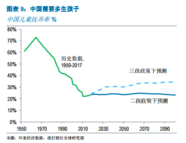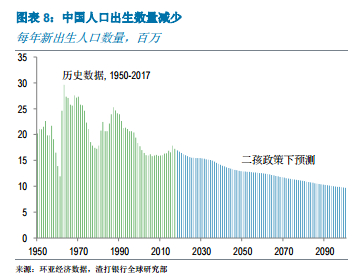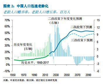 根据我们得估算,如果延续二孩政策(一对夫妇最多可生育两个孩子)2018年到2030年期间劳动年龄人口(15-64 岁)平均每年将下降220万人2031-2050年期间平均每年将下降750万人,因此,2018- 2050 年,中国劳动力总人口将减少1.79亿人,直接影响到长期经济增长前景。即便假定 2018-2050 年期间其他因素不变,仅劳动力减少一项可能拉低年均经济增长率1个百分点,而中国计划在本世纪中成为世界领先经济体。