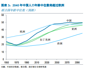 2. 中国人口迅速老龄化。我们的分析显示,在二孩政策下,到 2065 年,老龄人口赡养率(65 岁以上老龄人口占劳动力人口的比重)或将从 2017 年的 13.3%剧烈上升 至 55%(图表 2),而根据联合国的预测,全球平均赡养率水平为 2017 年 13.3%,2065 年将达到 30%。中国总人口的年龄中位数从 1970 年的 19.3 提高到 2017 年的 37.6,超过 2017 年世界平均年龄中位数 30.1(图表 3)。联合国预测到 2040 年,中国人口年龄中位数将超过欧洲平均值 46.9,成为。日本、韩国、美国和英国等国家的实际经验表明,人口老龄化通常伴随着生产效率和经济增长速度降低。