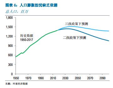 3. 如果取消生育限制,中国人口数量不太可能出现爆炸式增长。即便假定当前的所有二胎家庭在生育政策完全放开后会生育第三胎,我们估算中国总人口将在 2039 年达到 15.15 亿峰值,2017 年则为 13.90 亿(图表 6)。到 2100 年,预计中国总人口会下降到低于当前水平 13.68 亿。相较之下,如果继续实施二孩政策,预计中国总人口将在 2034 年进入高原层,2035-2080 年人口会加速下降,到 2100 年,我们预计中国总人口将达到大约 10.57 亿,比当前水平下降 24%。