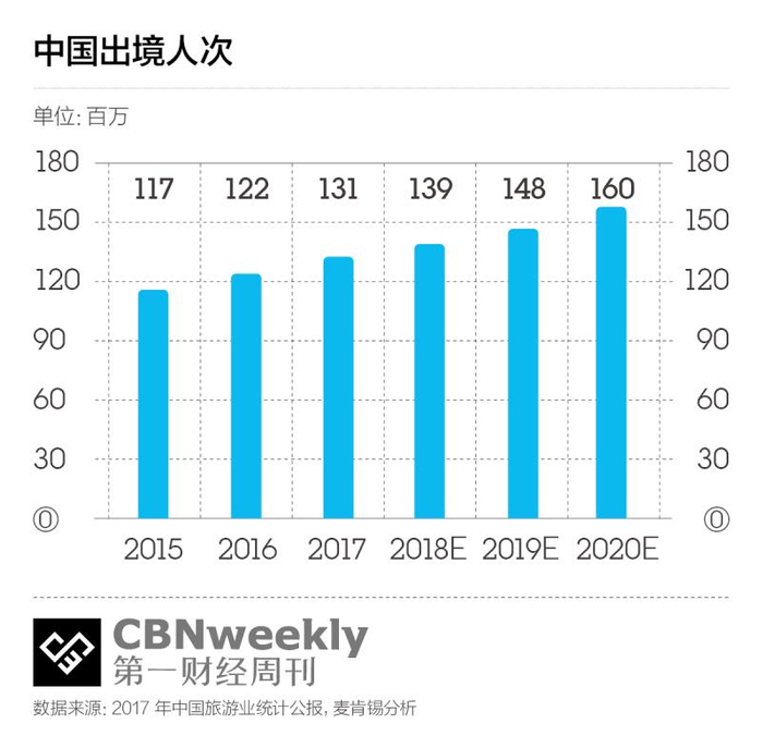 2017年,中国出境旅游的人次约为1.3亿,创造了单次行程消费额的全球第一。体量巨大的市场依然在经历高速的成长,麦肯锡分析认为,如果维持6.1%的年复合增长率,2020年这个市场的市值将超过20320亿元人民币。收入的提高,让中国人的出境经验愈发丰富,信息获取、国际航线也日益丰富,甚至各国对于中国旅行者的签证政策也都在放宽。