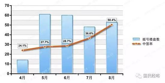 从4月到8月,平均摇号中签率从24.1%上升到50.4%,翻了一倍还多。