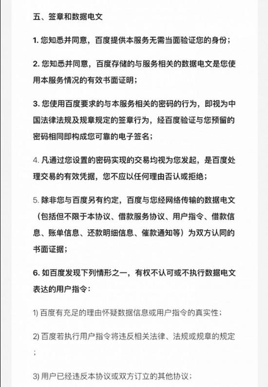 根据这份协议,百度有钱花App使用百度账号就可以登录,并不需要单独开通权限、注册账号。该协议第五部分第一、三、四条还规定称,百度提供服务无需当面验证身份,申请人使用相关密码的行为,就被视为有法律效力的签章行为,构成电子签名,申请人不能用任何理由否认或拒绝。