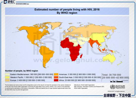 通过2016年世界卫生组织的统计数据可视化来看,全球艾滋病患者的分布会更清晰。